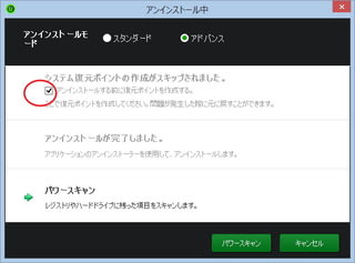念のため、「アンインストールする前に復元ポイントを作成する」にチェック。