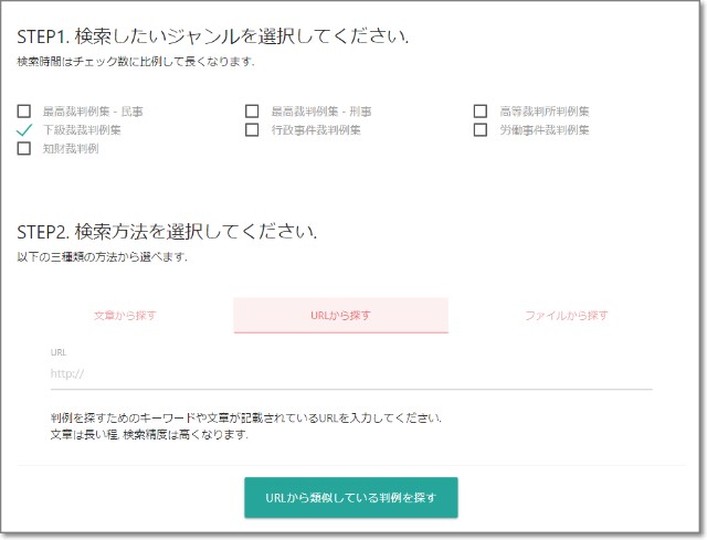裁判所の種類を選び、文章のアップロード法を選んで、「~判例を探す」をクリック。