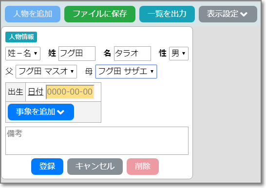 「人物を追加」で、名前を入力し、性別・父母を選択。