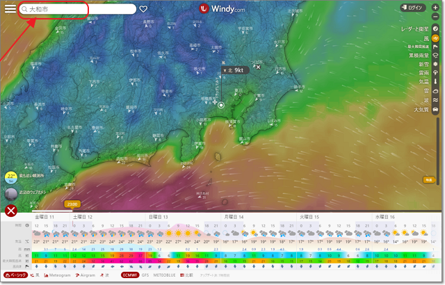 左上の検索窓に地名を入れると、その地域の5日間の天気予報が出ます。