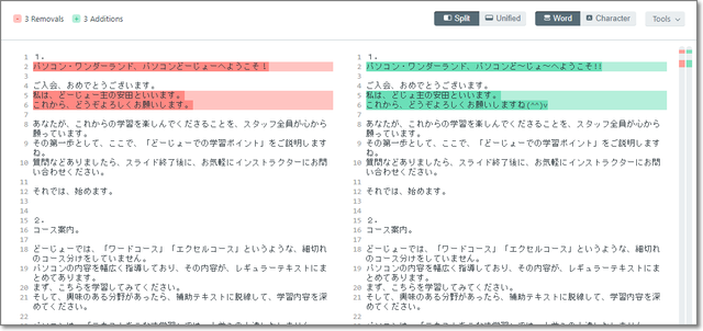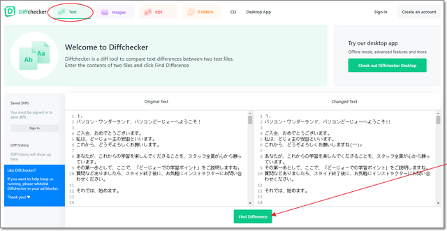 左右にそれぞれ文章をコピペして、「Find Difference」ボタンをクリック。