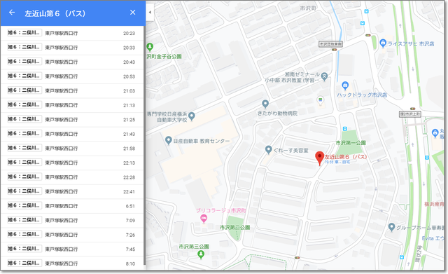 Googleマップがバス時刻表に対応 パソコン X Facebook LINE コピー 2019.11.17 Googleマップが、バス停の時刻表を表示できるようになりました。 ブラウザ(PC)でもアプリ(スマホ)でも、表示できます。 「都内のバス停」とのことですが、大和市や横浜市も表示できるようです。 地図中の、バス停アイコンをクリック(タップ)。 系統が表示されるので、いずれかをクリック。 現在時からの時刻表が、ズラーッと出ます。 test ad