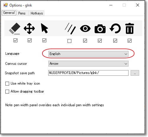 ペンの太さを変更したくなると思うので、太さ設定アイコンにチェックを。