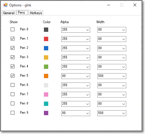 「Pens」タブで、ペンの数や色を設定できます。