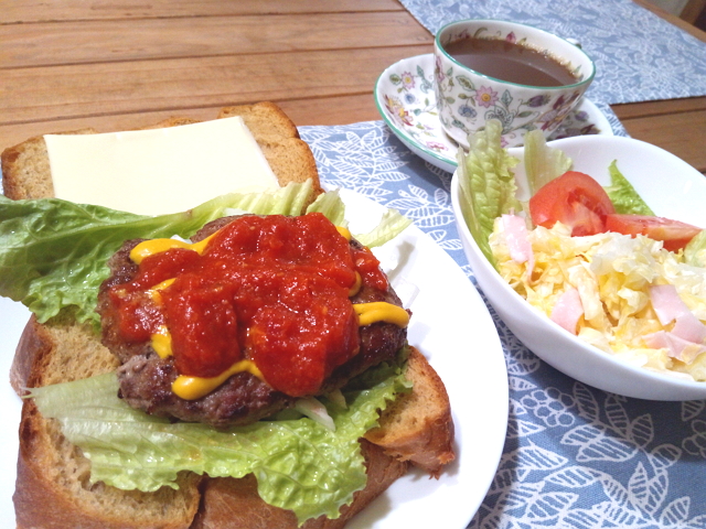 それに、レタス・タマネギ・スライスチーズ・焼いたハンバーグをはさんで、できあがり。