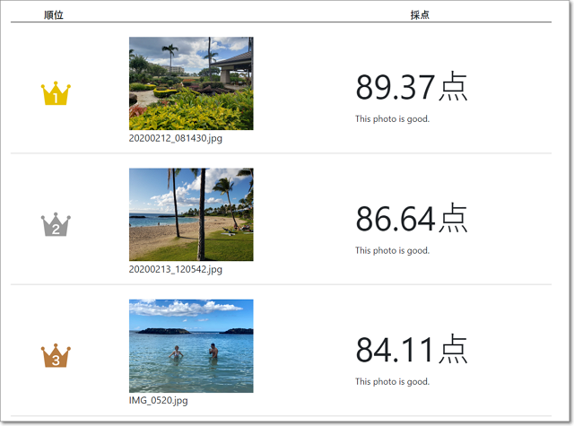 AIが写真を採点 パソコン X Facebook LINE コピー 2020.03.23 人工知能が、写真を100点満点で採点してくれるサービス。 「scoringAC」 採点基準は、明るさ・色合いなどで、「写真の芸術性」などは評価されません。 「ちゃんと撮れているか」をチェックするなど、実用的に利用してもいいし、 「どっちが高得点?」クイズなど、遊びに利用してもいいかも。 写真をまとめて、ドラッグ&ドロップするだけ。 すぐに、得点順にならべてくれます。 各写真の講評のようなものはありません。 test ad