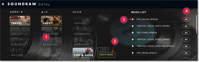 イメージやジャンルを指定すると、AIが15曲を作曲。