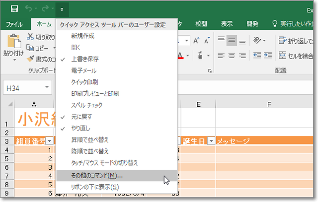 クイックアクセスツールバー(タイトルバーの左のほう)の「ユーザー設定」をクリック