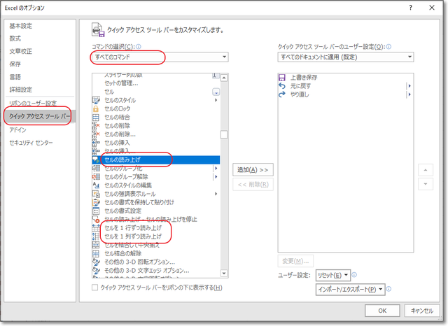 「セルを1行ずつ読み上げ」「セルを1列ずつ読み上げ」も「追加」しておくと便利。