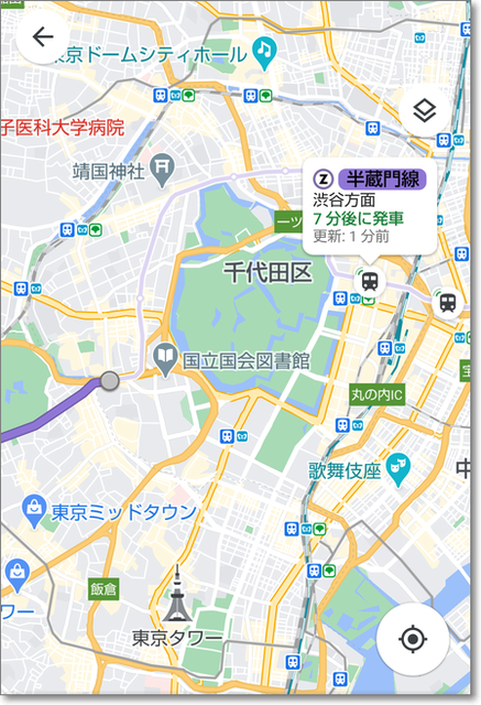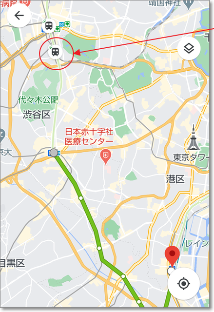出発駅に向かう電車アイコン(黒)が表示されます。