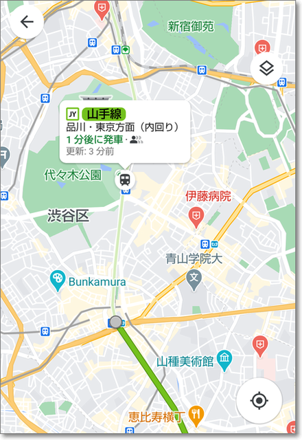 山手線の渋谷に向かう電車は表示されますが、田園都市線は表示されません。