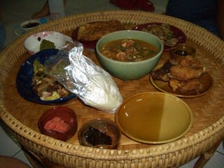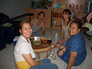 昨日は、スコールが来たので、オイさんの美容室の床にすわって、みんなで夕食。