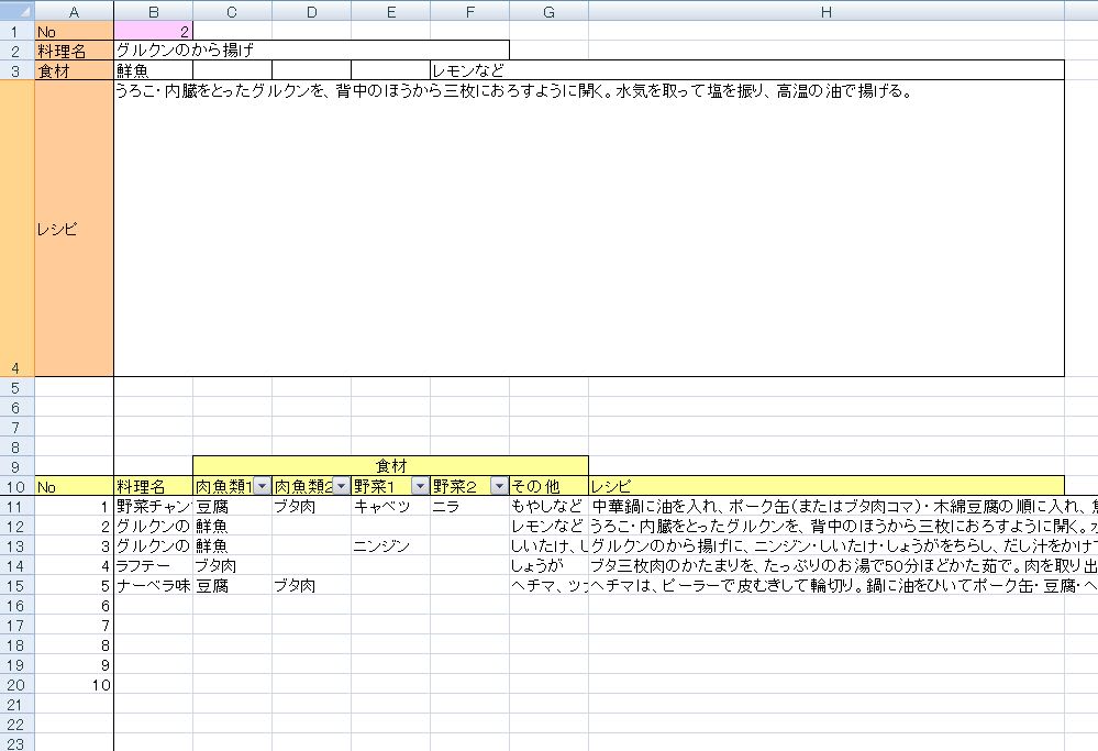 ・オートフィルタで、ある食材を使う料理だけ表示させる。