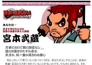 日本歴史占い パソコン X Facebook LINE コピー 2009.07.02 「占い」って、ぜ~んぜん興味ないです。 ……といいつつ、 偶然、「日本歴史占い」というページに行ってしまって、 つい、やってしまいました f(^^;) ボクは、宮本武蔵だそうです。 カッコいい~♪ 「天才か、紙一重か」 ……天才ではないので、紙一重のほうですね。 うん、当たってる! ヾ(・・;) test ad