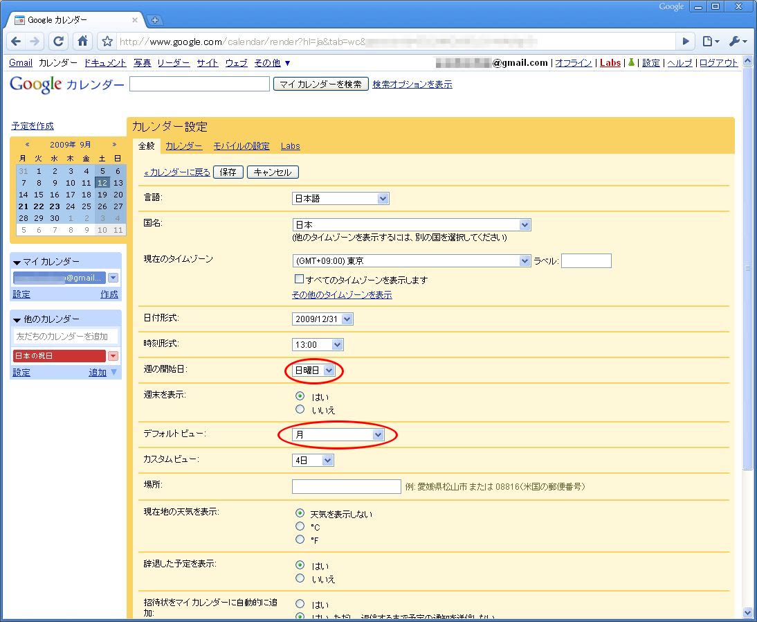 デフォルトは「月曜日から」「週表示」になっているので、