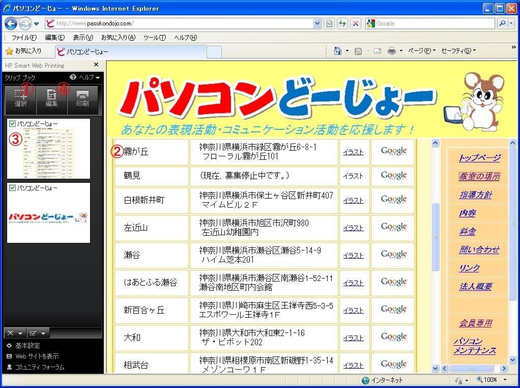 ①好きなWebページを表示して、「選択」ボタンをクリック。