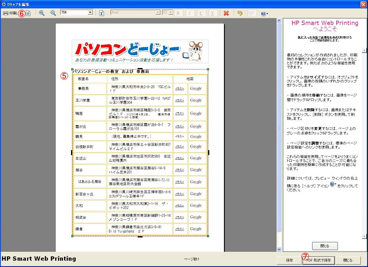 出来上がったら、⑥「印刷」するか、⑦「PDF形式で保存」か、好きな方をクリック。