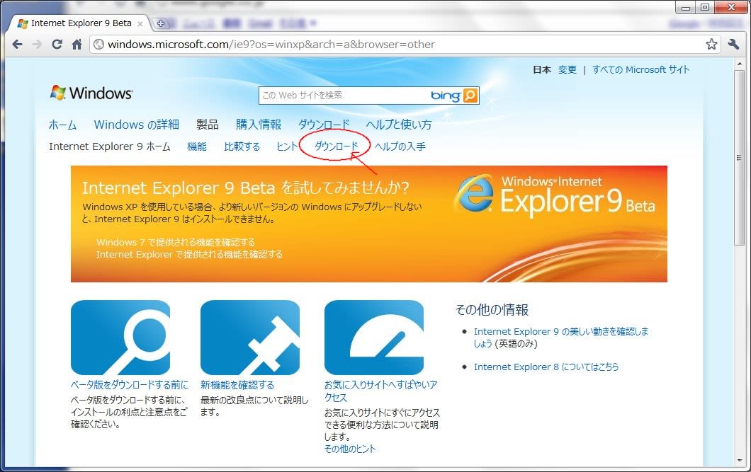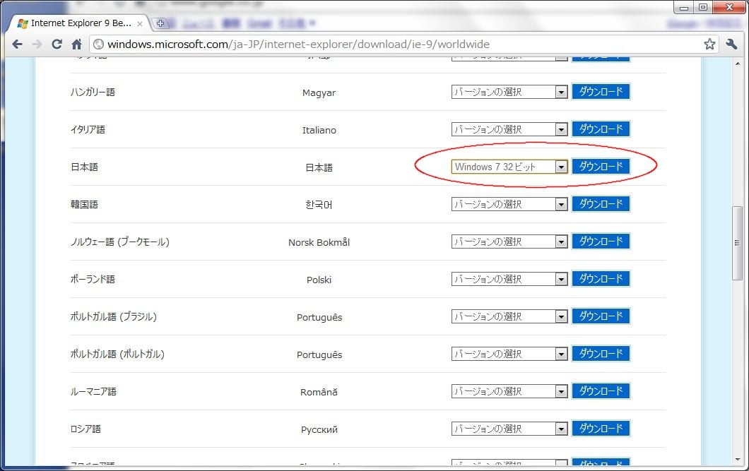 IE9のダウンロードページ(こちらをクリック)を開き、