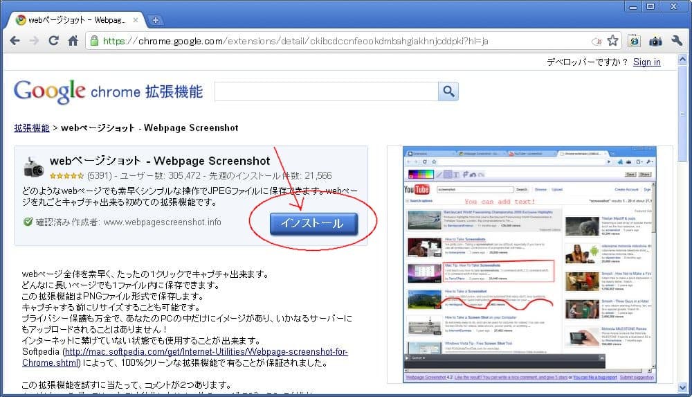 「webページショット」という拡張機能の紹介が出ていたので、