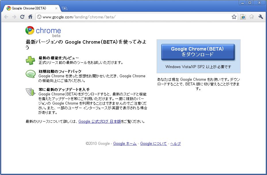 こちらのページから、「Google Chrome (BETA)をダウンロード」をクリックして、