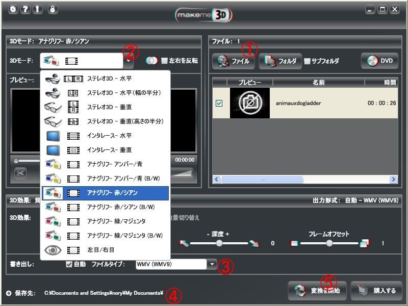 ②どんな3D動画に変換するか、選択します。