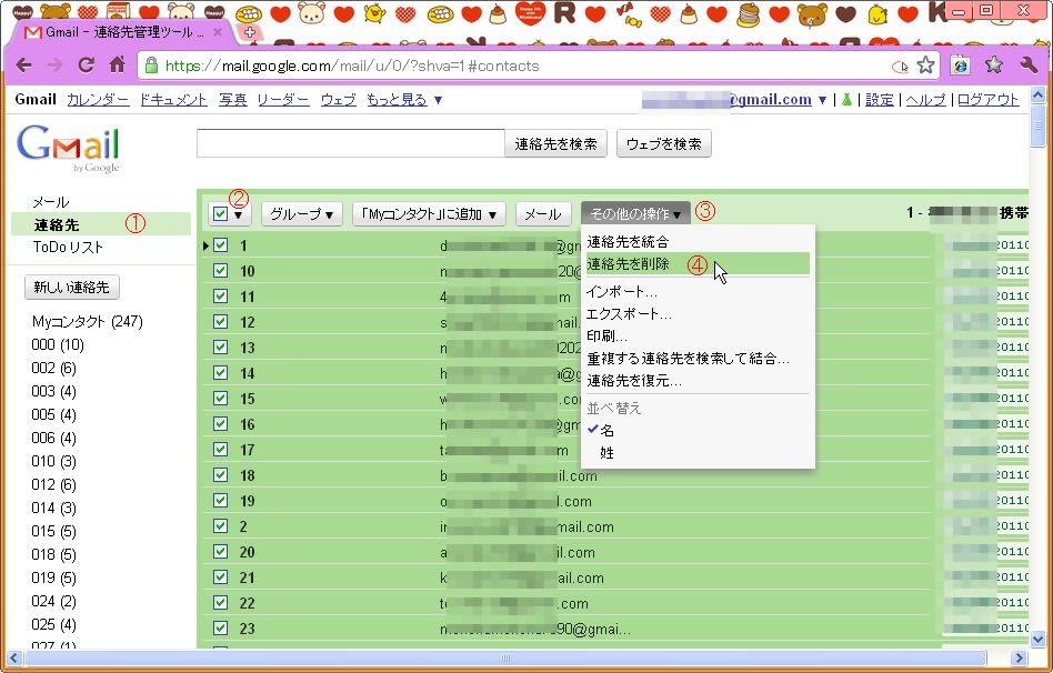 ①「連絡先」→②選択欄の▼をクリックして「すべて」→③「その他の操作」