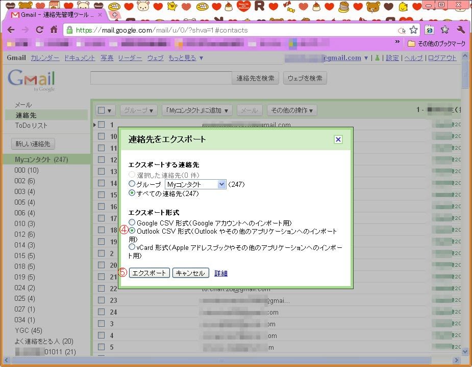 ④「Outlook  CSV形式」を選んで(ほかの形式でもいいかも)→⑤「エクスポート」