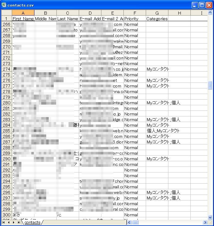 ダウンロードした「contacts.csv」を、エクセルなどで開きます。