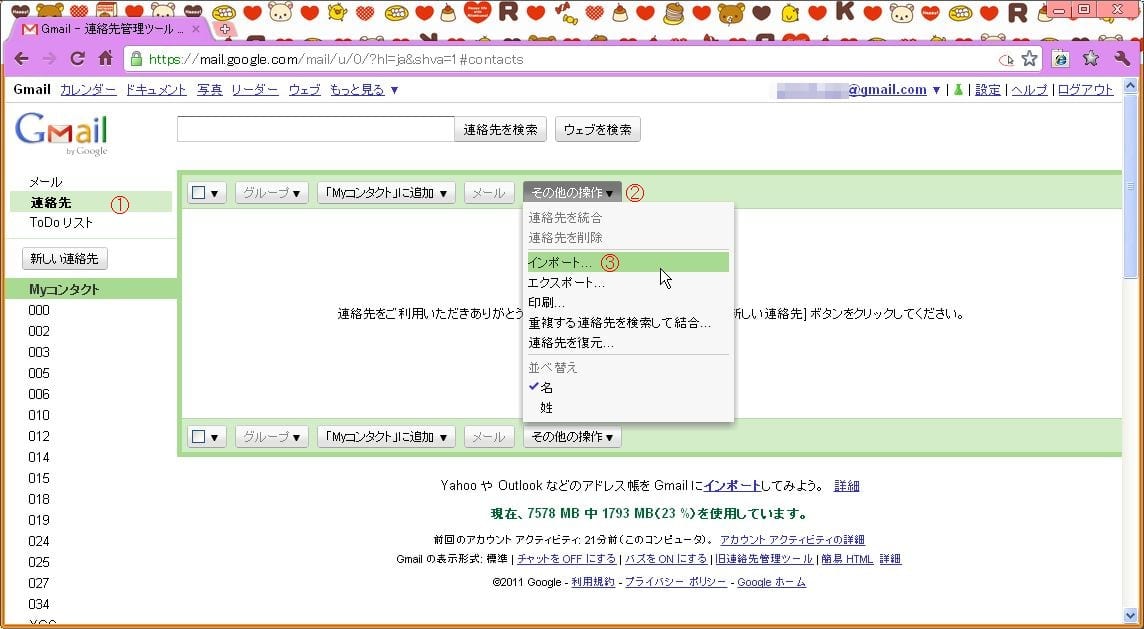 ①「連絡先」→②「その他の操作」→③「インポート」