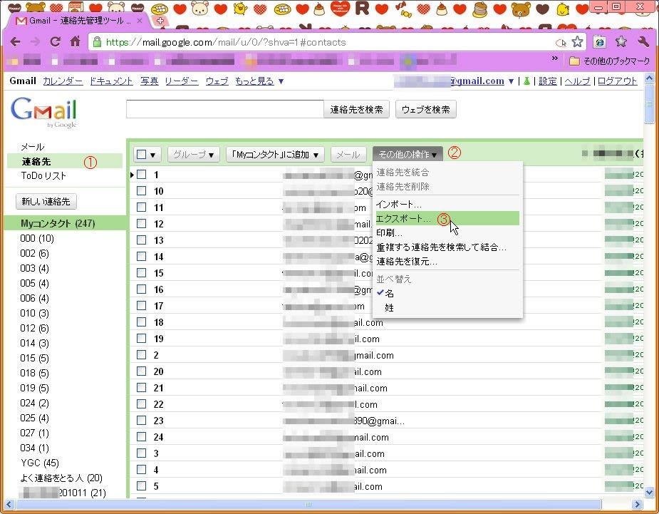 ①「連絡先」→②「その他の操作」→③「エクスポート」