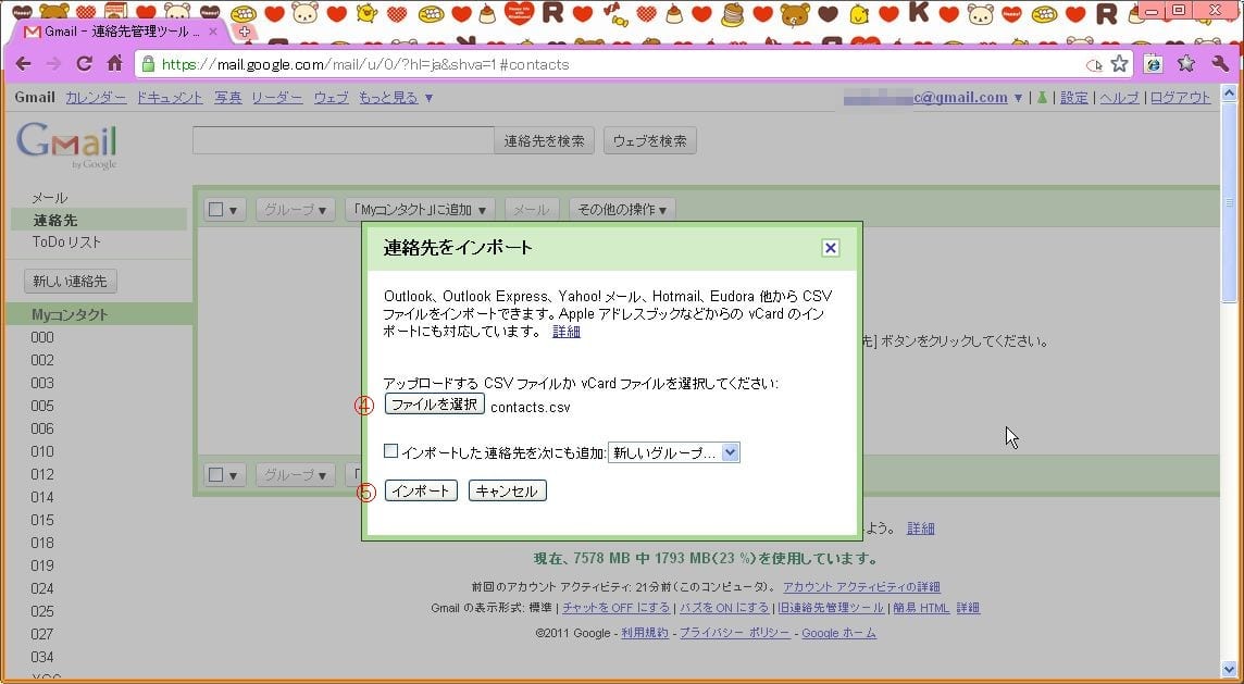 ④「ファイルを選択」でcontacts.csvを選んで→⑤「インポート」