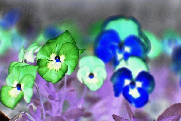最初の10秒間、ヘンな色合いの写真の時に、真ん中のパンジーに注目していると、
