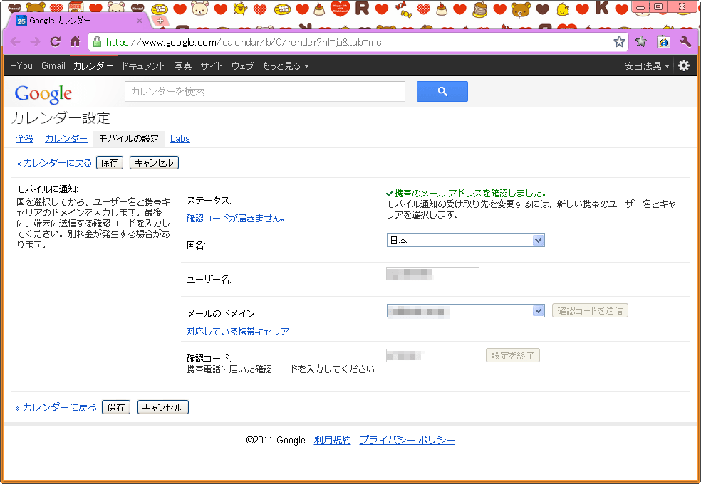 「モバイルの設定」タブで、自分の携帯メールを登録し、「確認コードを送信」。