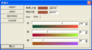 右クリック→色加工で、RGB(赤緑青コード)やHSV(色相・彩度・明度コード)で