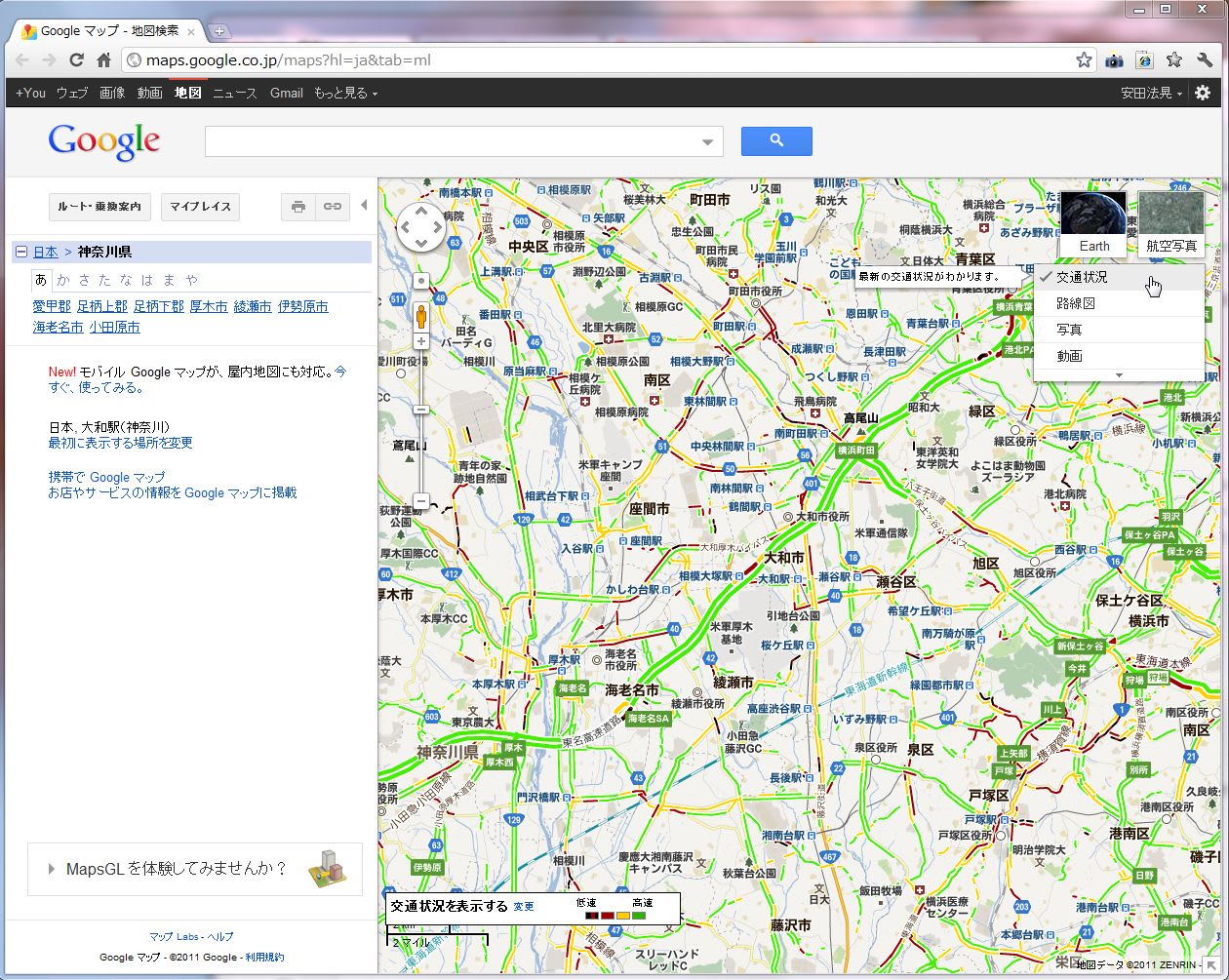 パソコンGoogle地図が、渋滞情報を表示するようになりました。