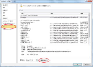 「Excel アドイン」を選んで、「設定」ボタンをクリック。