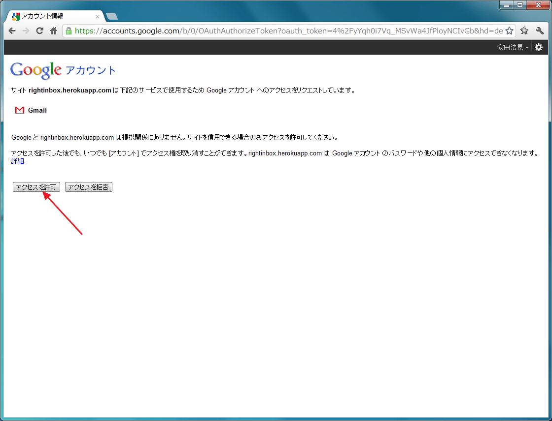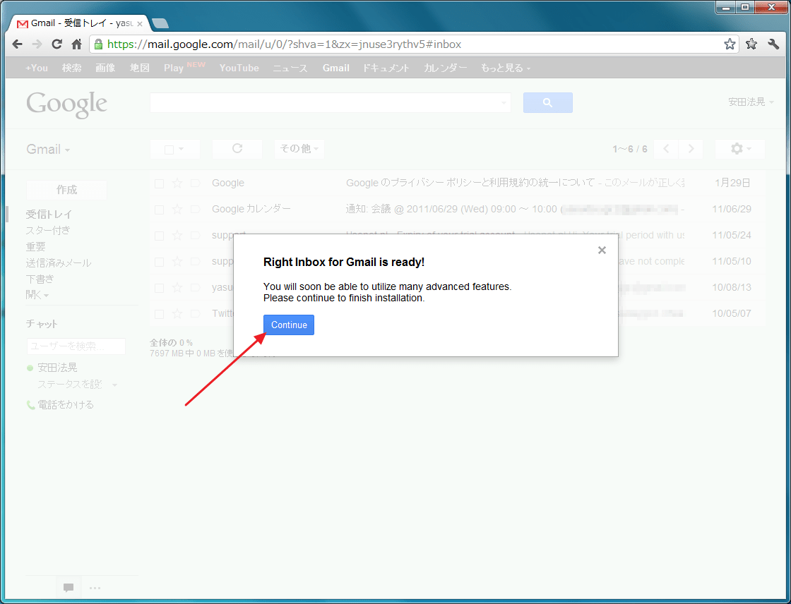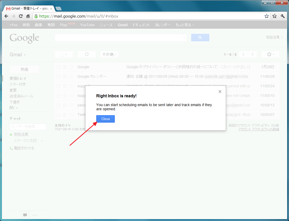 Google Chromeで「Right Inbox」ページを開いて、「+CHROMEに追加」ボタンをクリック。