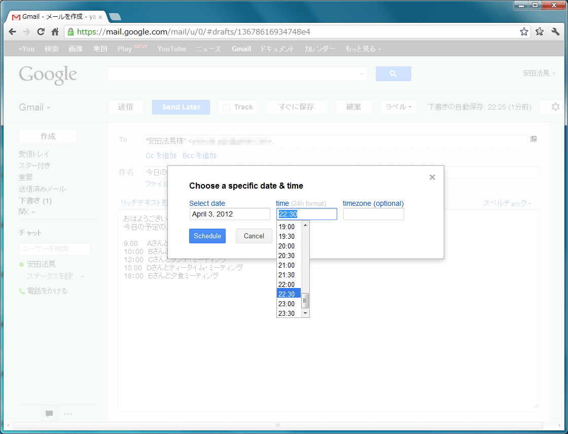 Gメールで送信予約をする、Google Chromeの拡張機能です。