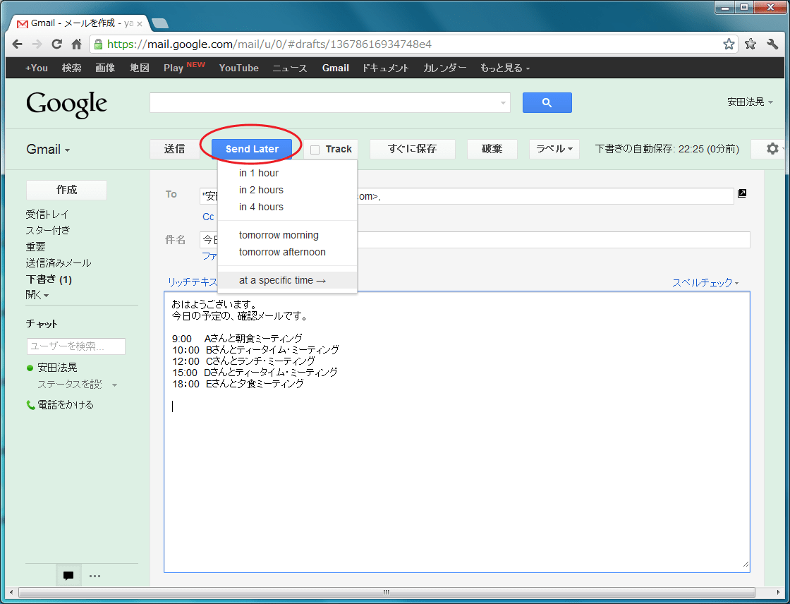 上のほうに、「Send Later(あとで送る)」ボタンができています。