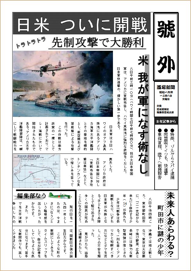 社会科の宿題 その他 X Facebook LINE コピー 2012.04.18 息子が、社会の宿題で 「第二次世界大戦をテーマに、新聞づくり」 というのをやっていました。 手書きですが、内容がおもしろかったので、 それをパクって、ワードで作ってみました。 明日、テキストにします。 test ad