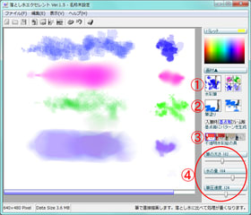 ④筆の太さ、水の量、筆圧速度を、設定します。