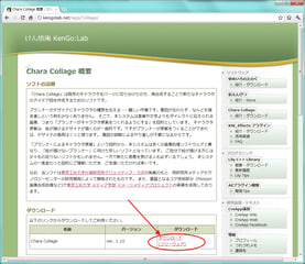 「Chara Collage(キャラコラージュ)」サイトの、「ダウンロード」をクリック。
