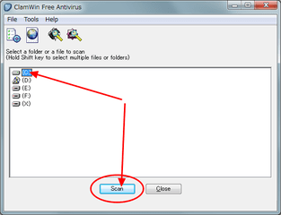 ウィルスチェックしたいドライブを指定して、「Scan」をクリック。