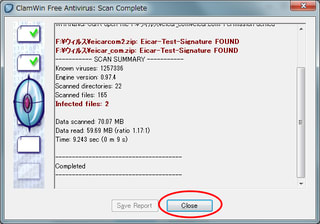 「Infected files:」が、検出したウィルスの数。