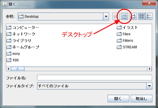 ↓の家マークをクリックすると、「デスクトップ」を表示させられます。