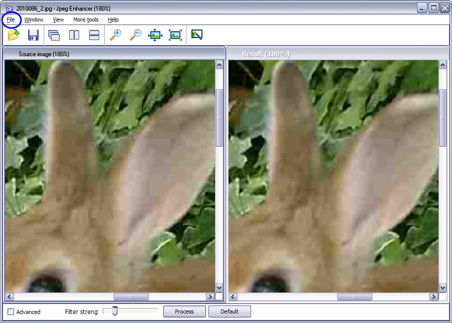 圧縮率を上げすぎて、画質が粗くなってしまったJPGファイルを、