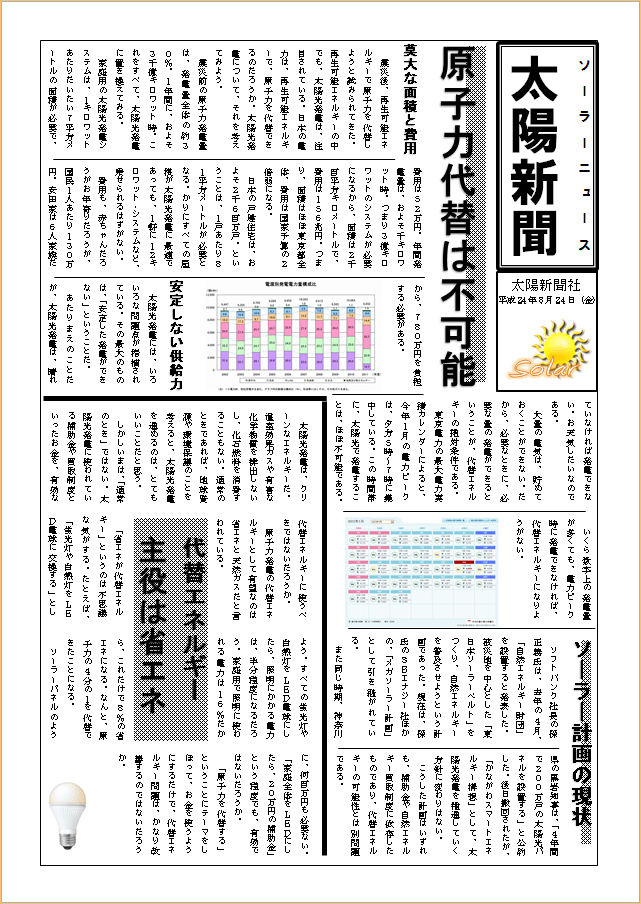 まず、太陽子の買い取り金を有効な代替エネルギーに使えというが、この部分が理屈だっていない。考察に基づいたわけでもなく、太陽光は有効ではないと思う個人主観では納得いくまい。
