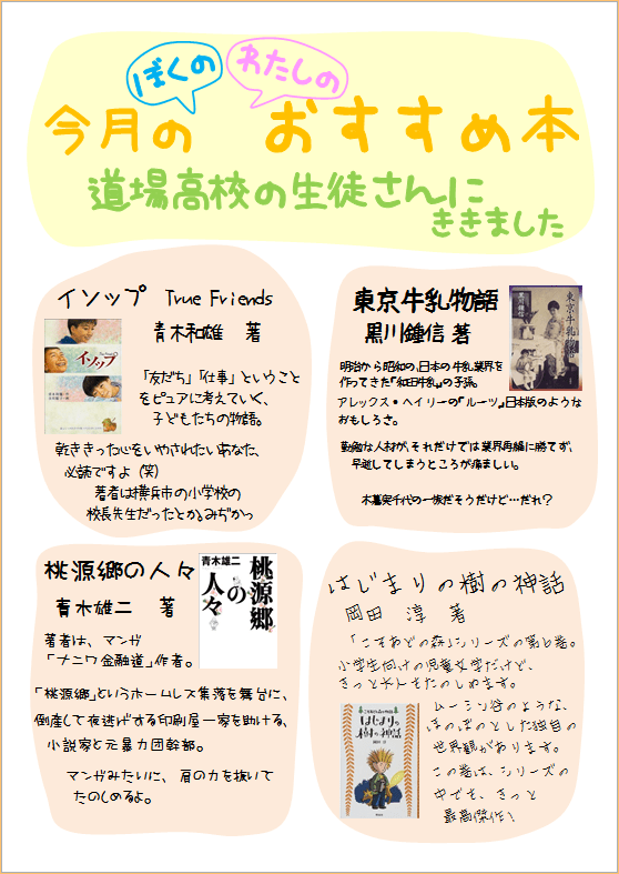 手書きっぽい図書案内 教材(Word) X Facebook LINE コピー 2012.09.16 図書館にあるような「今月のおすすめ本」案内を、 手書きっぽさにこだわって作ってみましょう。 ポイントは、手書きフリーフォントと、曲線の編集です。 自分の読書録を、こんな感じでまとめていくのも、いいかも。 テキストのダウンロードは、こちら。 test ad