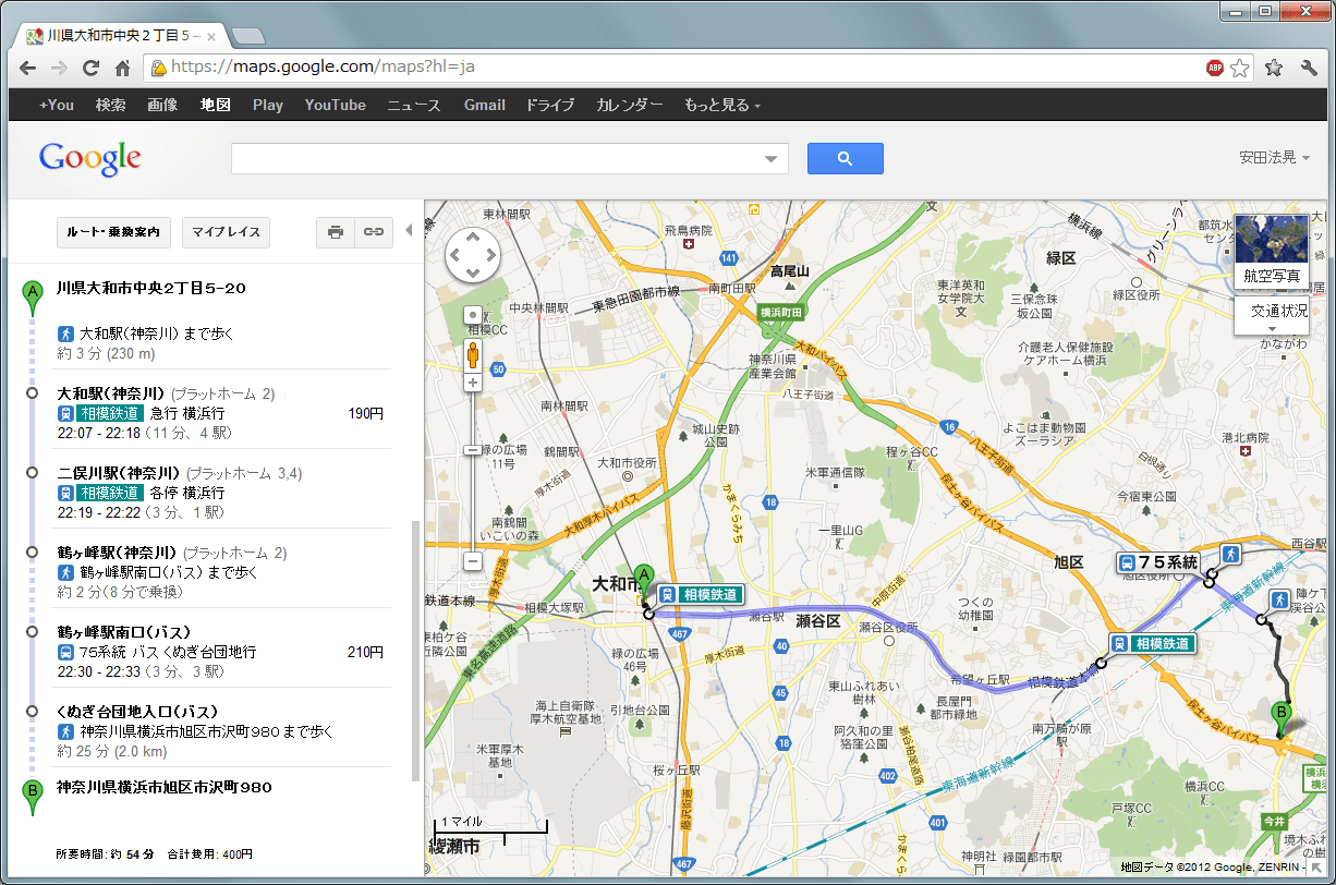 では、大和事務室から左近山教室までのルートを、検索してみました。