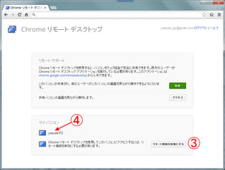 外出する前に、自宅パソコンで③「リモート接続を有効にする」をクリック。